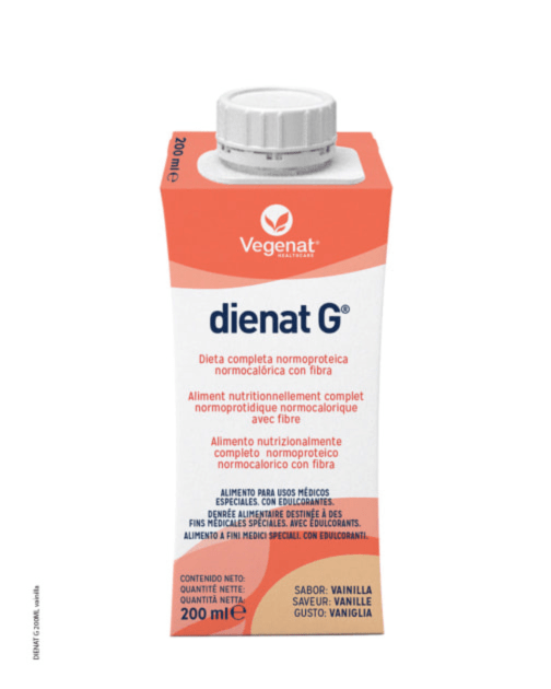 Dienat ® G es un suplemento especializado para el tratamiento dietético de pacientes desnutridos que presenten disfunción intestinal. En forma de dieta completa normoproteica y normocalórica con fibra fermentable (100% goma guar parcialmente hidrolizada).